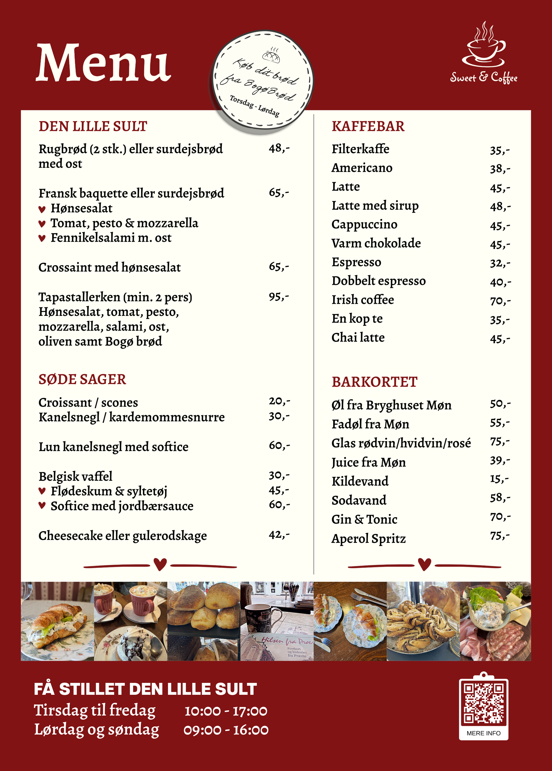 Nyd en dejlig friskbrygget kaffe, og er du lækkersulten, er der både kardemommesnurrer og croissanter og meget andet lunt, lækkert og økologisk fra Bogø Brød.